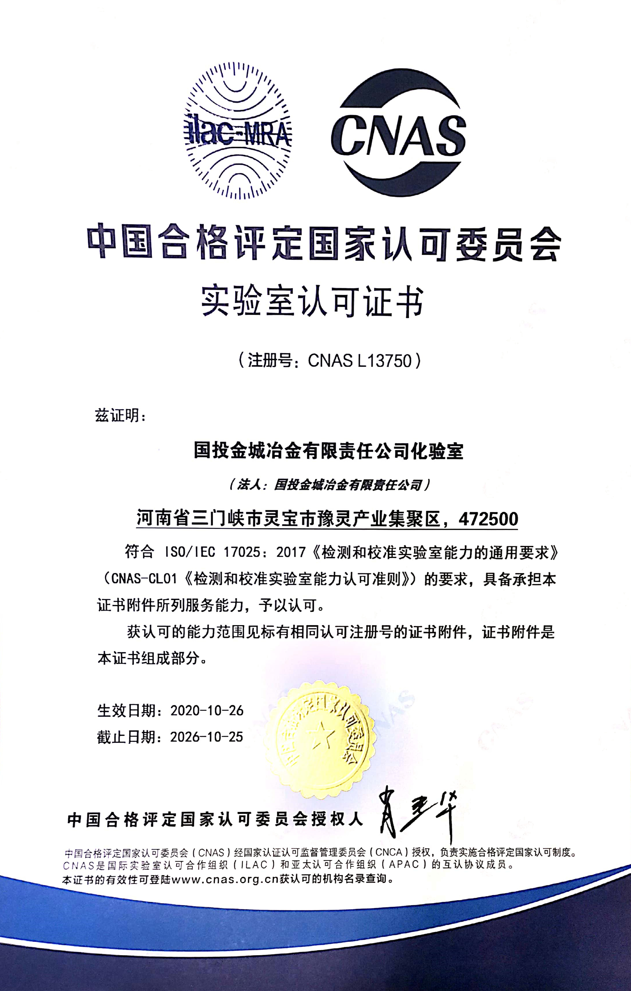 2020年10月26日,公司化验室(现更名为检验中心)获得中国合格评定国家认可委员会(cnas)授予的实验室认可证书(注册号:cnasl13750 ),正式跨入国家实验室认可行列。