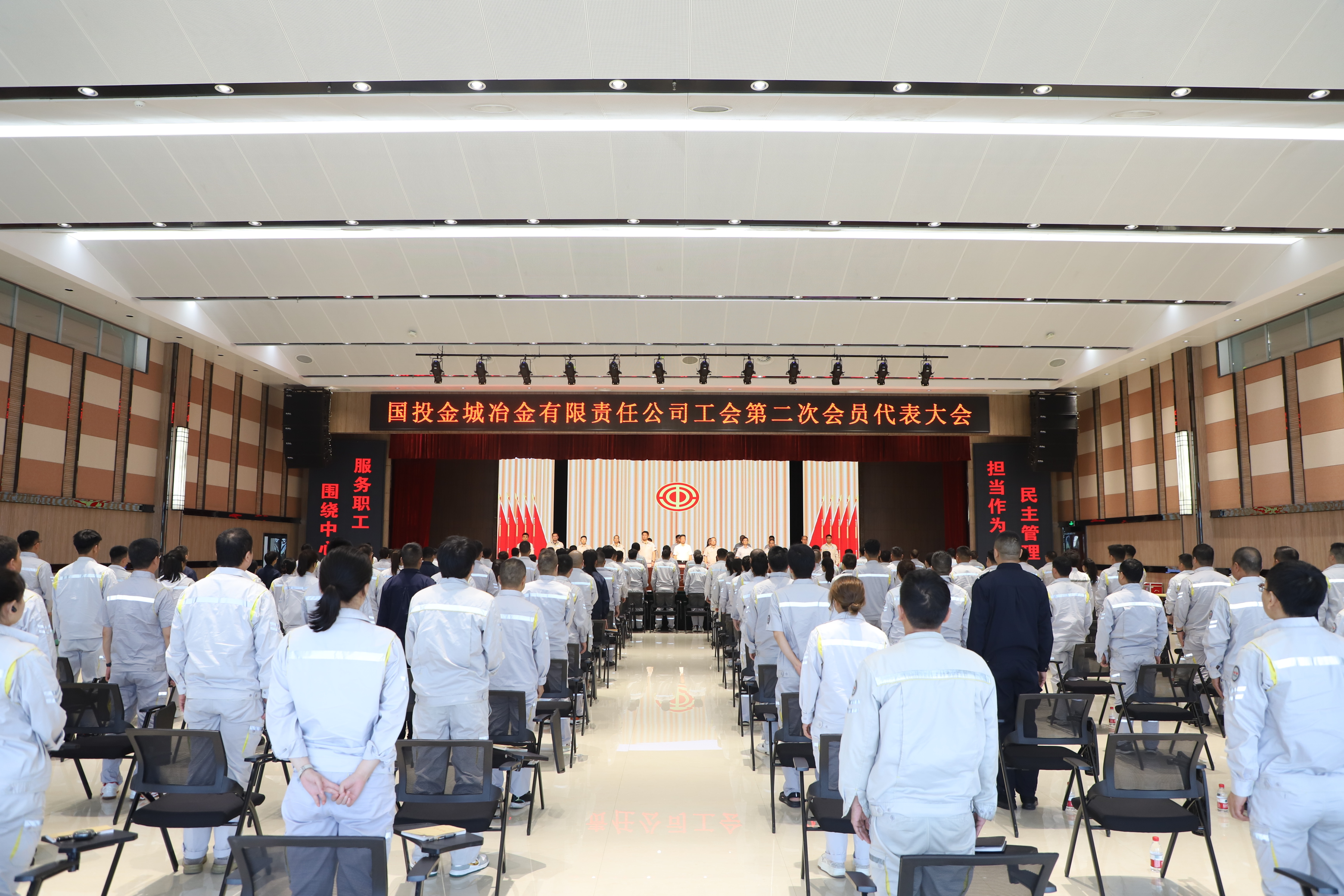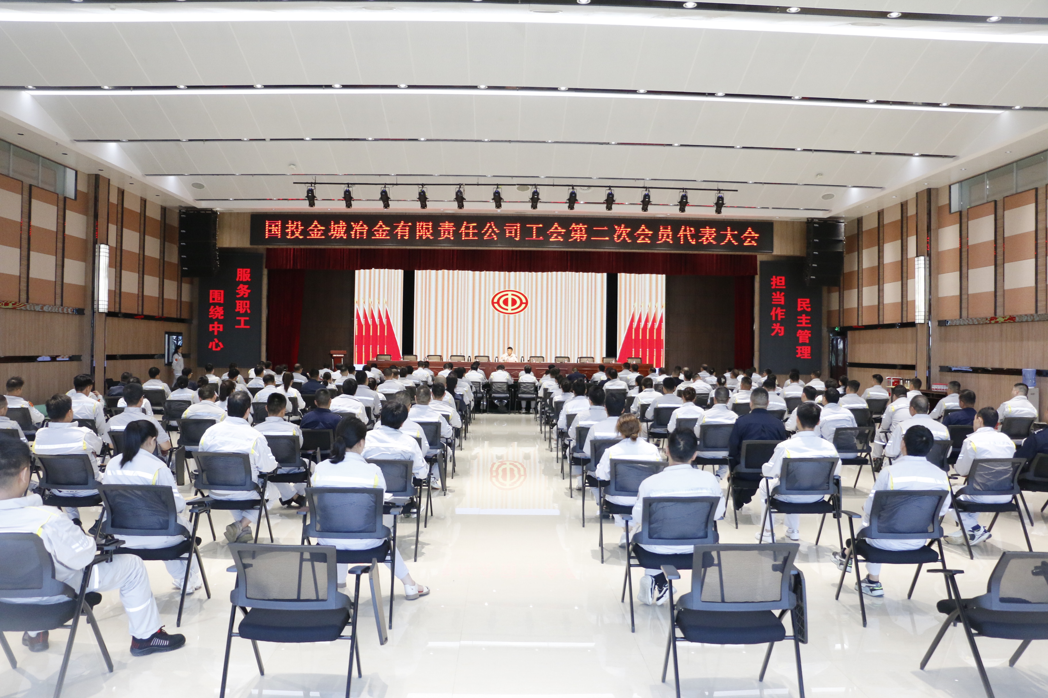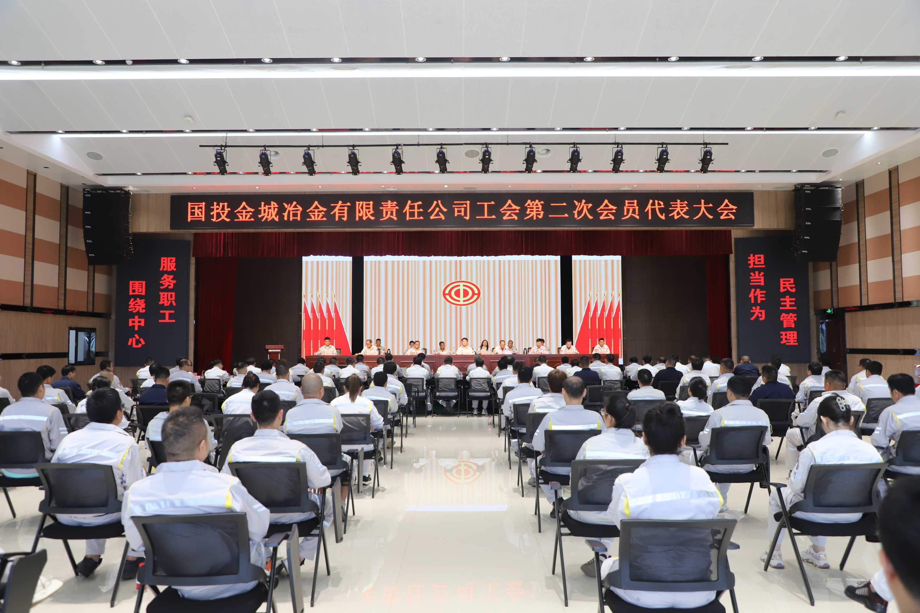职工礼堂内,灯光璀璨,气氛庄严而热烈。主席台上,正中心的工会会标在两侧红色旗帜的映衬下,熠熠生辉。主席台上方led屏“国投金城冶金有限责任公司工会第二次会员代表大会”的会标庄重醒目。