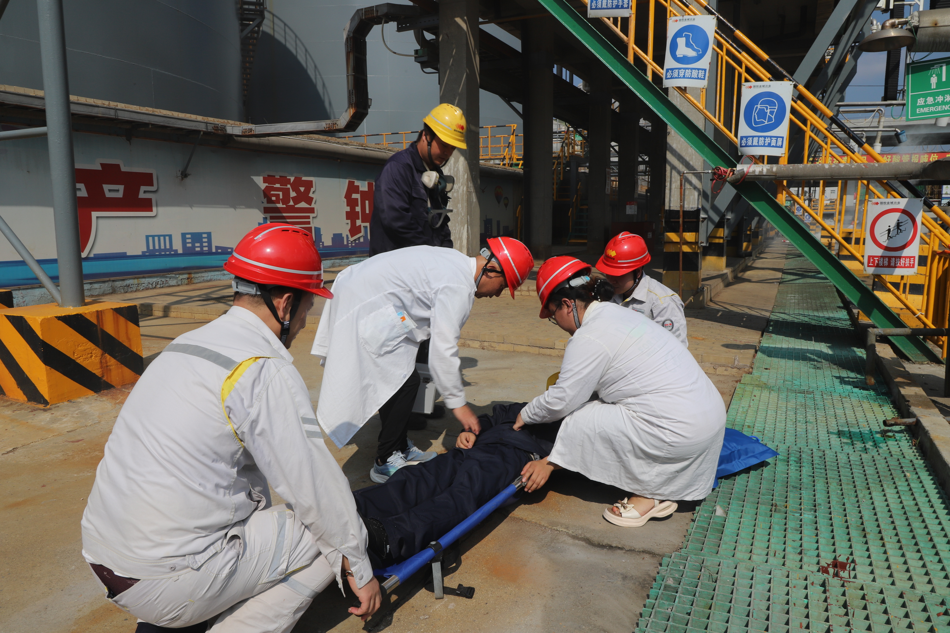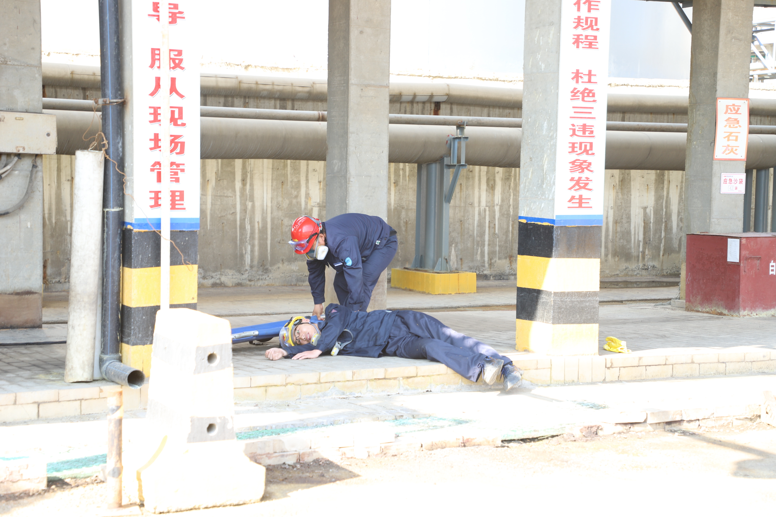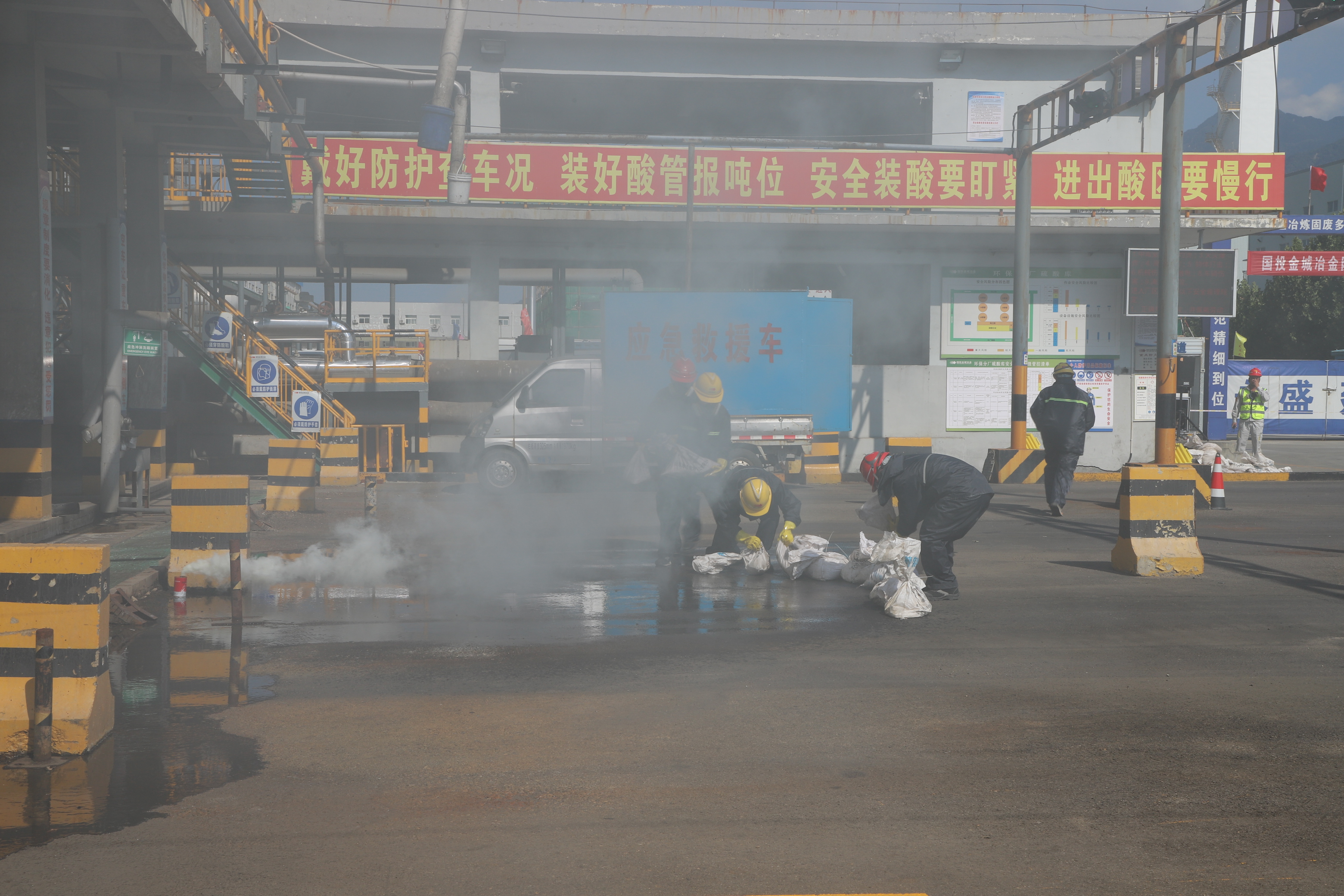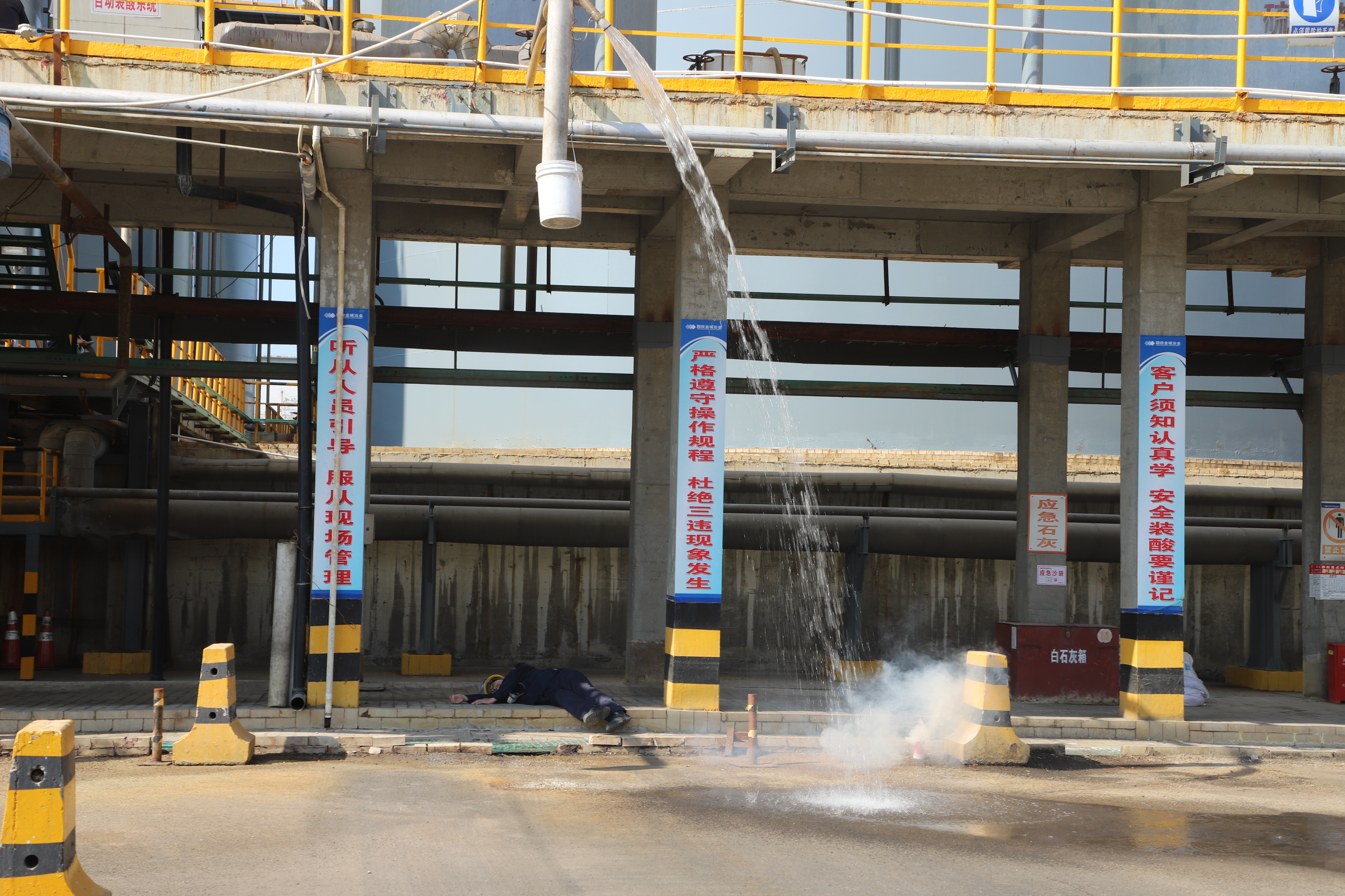 演练模拟当班操作工在硫酸库装酸平台下巡检时,因3#高位槽出口管道阀门故障导致硫酸泄漏,操作工被泄漏硫酸烧伤并中毒为背景展开,分阶段演示了应急救援预案启动后,信息报送、应急响应、警戒疏散、伤员救治和转送、抢险救援、筑堤围堵、地面冲洗、取样化验等环节执行情况。通过各工作组的紧密配合,泄漏的酸液得到妥善处理,未造成环境污染,险情得到排除,演练达到预期效果。